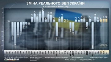 Українська економіка продовжує повільне відновлення після найглибшого обвалу з часів незалежності. У 2022 році на тлі повномасштабного вторгнення рф, реальний ВВП України скоротився на 28,8%. Це — найбільше падіння за весь період спостережень.30 травня 2025 р.