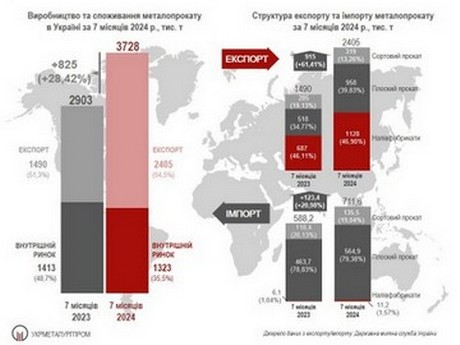 За 7 місяців 2024 р. ємність внутрішнього ринку становила 2034,6 тис. т металопрокату, з яких 711,6 тис. т або 34,97% припадає на імпорт. В січні-липні 2023 р. ємність внутрішнього ринку була 2001,2 тис. т, з яких 588,2 тис. т або 29,39% імпортовано. Таким чином, за 7 місяців 2024 р. спостерігається збільшення ємності внутрішнього ринку відносно 7 місяців 2023 р. на 1,67%, з одночасним збільшенням частки імпортної складової на 5,58%.
