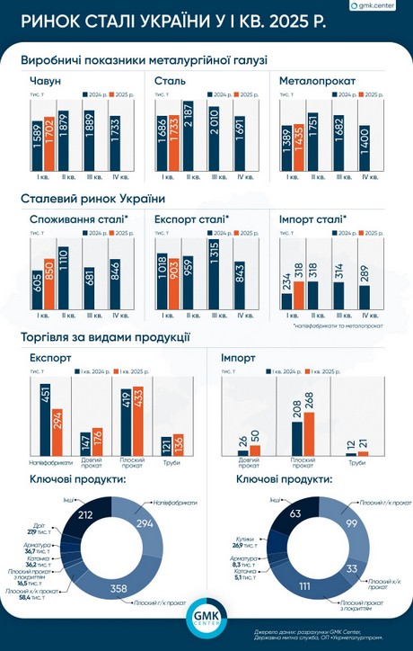 Ринок сталі України протягом I кварталу 2025 року показав різноспрямовані тенденції: виробництво основних видів продукції переважно зросло, внутрішнє споживання та імпорт також відновились, тоді як експорт продукції сповільнився.За підсумками січня-березня металургійні підприємства збільшили виплавку чавуну на 7,2% порівняно з аналогічним періодом 2024 року – до 1,7 млн т. Випуск сталі зріс на 2,7% р./р., до 1,73 млн т, а металопрокату – на 3,4% р./р., до 1,43 млн т. Водночас, порівняно з попереднім кварталом виробництво чавуну скоротилось на 1,8%, а сталі та прокату зросло на 2,5% відповідно.