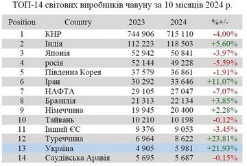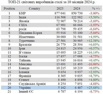 Україна (6,49 млн т або 125,68% відносно січня-жовтня 2023 р.) залишається на 20 місці серед 71 країни-виробника сталі.